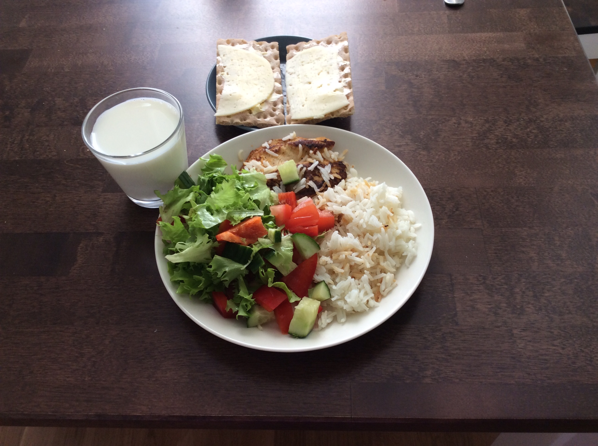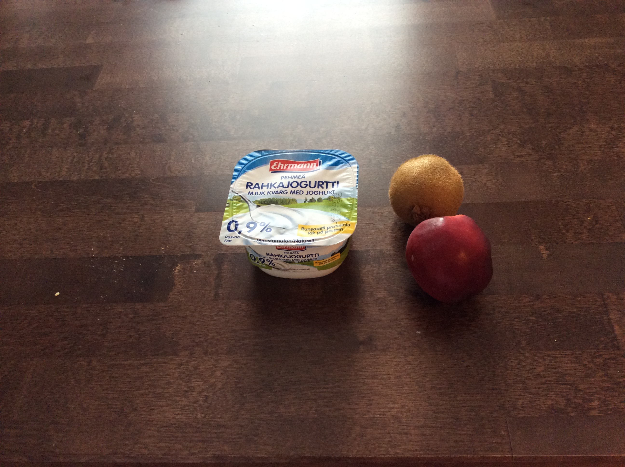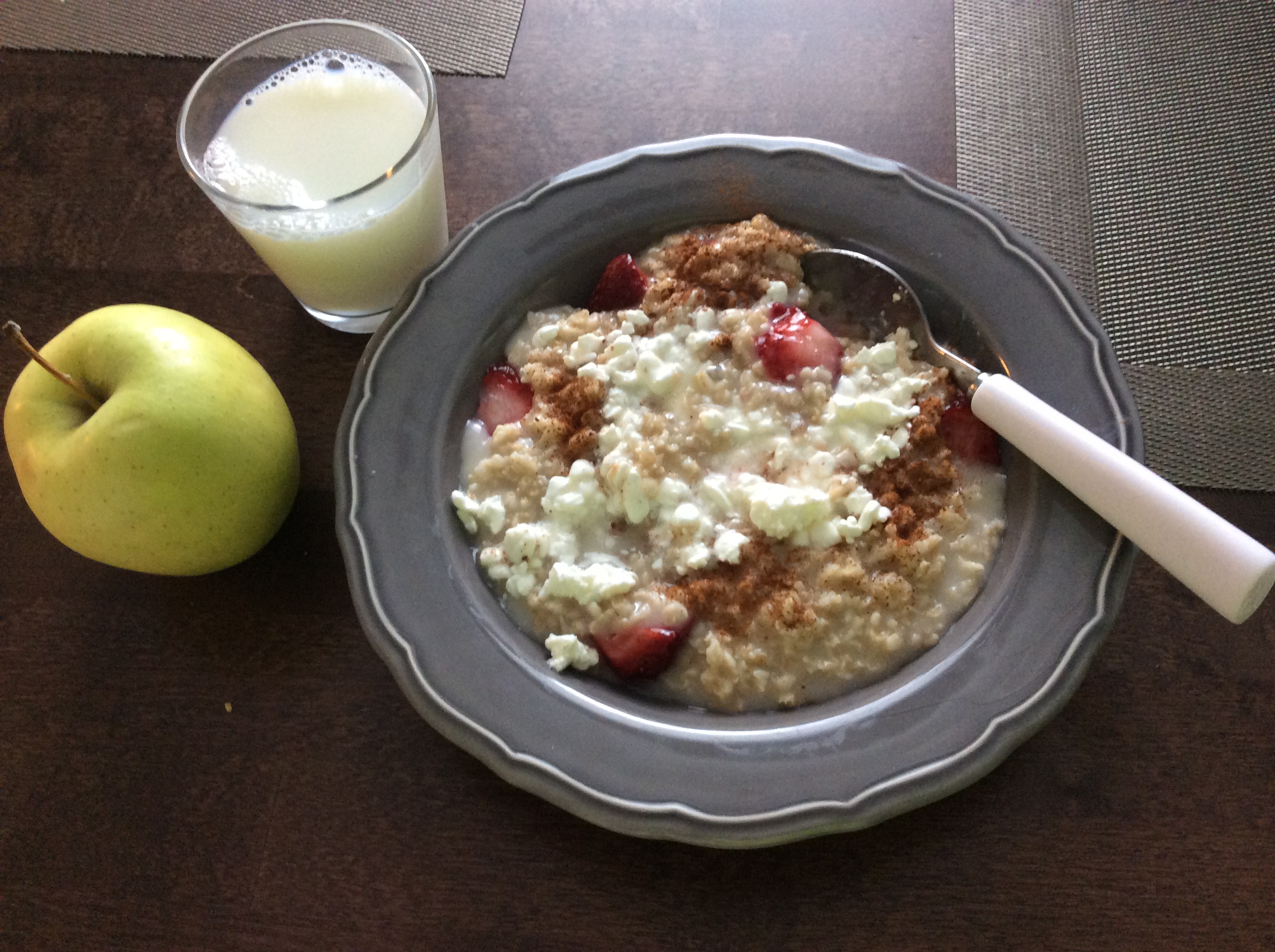 Aamupala: kaurahiutaleita, mansikoita, raejuustoa, vähän kanelia ja suolaa. Lisukkeena omena ja maitoa.
